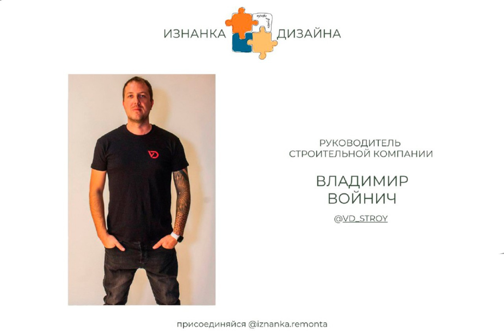 Тему портфолио и позиционирования себя, как специалиста в сфере дизайна интерьеров, поддержал и ВЛАДИМИР ВОЙНИЧ, рассказав на примере собственного бизнеса, как вырастить блог и развить с нуля свой личный бренд. Прораб, который за пару лет вырос до опытного руководителя строительной бригады – наглядный пример, как мы сами решаем, где быть завтра, и как быстро это «завтра» наступит.