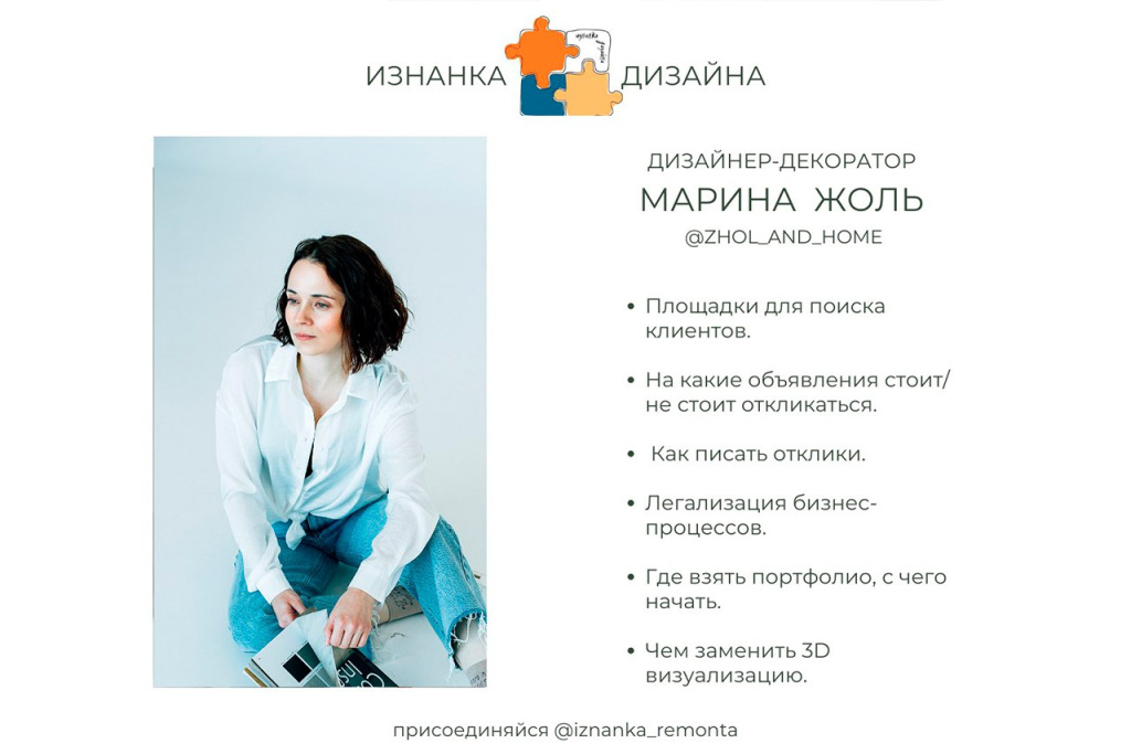 Пилотный проект «ИЗНАНКА ДИЗАЙНА», придуманный дизайнерами Натальей Зыбайло и Мариной Жоль для дизайнеров-новичков, создан с целью помочь тем, кто прошел обучение, но первого клиента пока не нашел, а также для тех, кто в профессии дизайнера интерьеров недавно и уже столкнулся с проблемой, где искать клиентов, как с ними общаться, чтобы получить заказ, что делать, когда заказ есть, а технических и практических знаний недостаточно, где искать подрядчиков, как собирать свое первое портфолио, как легализовать все бизнес-процессы.