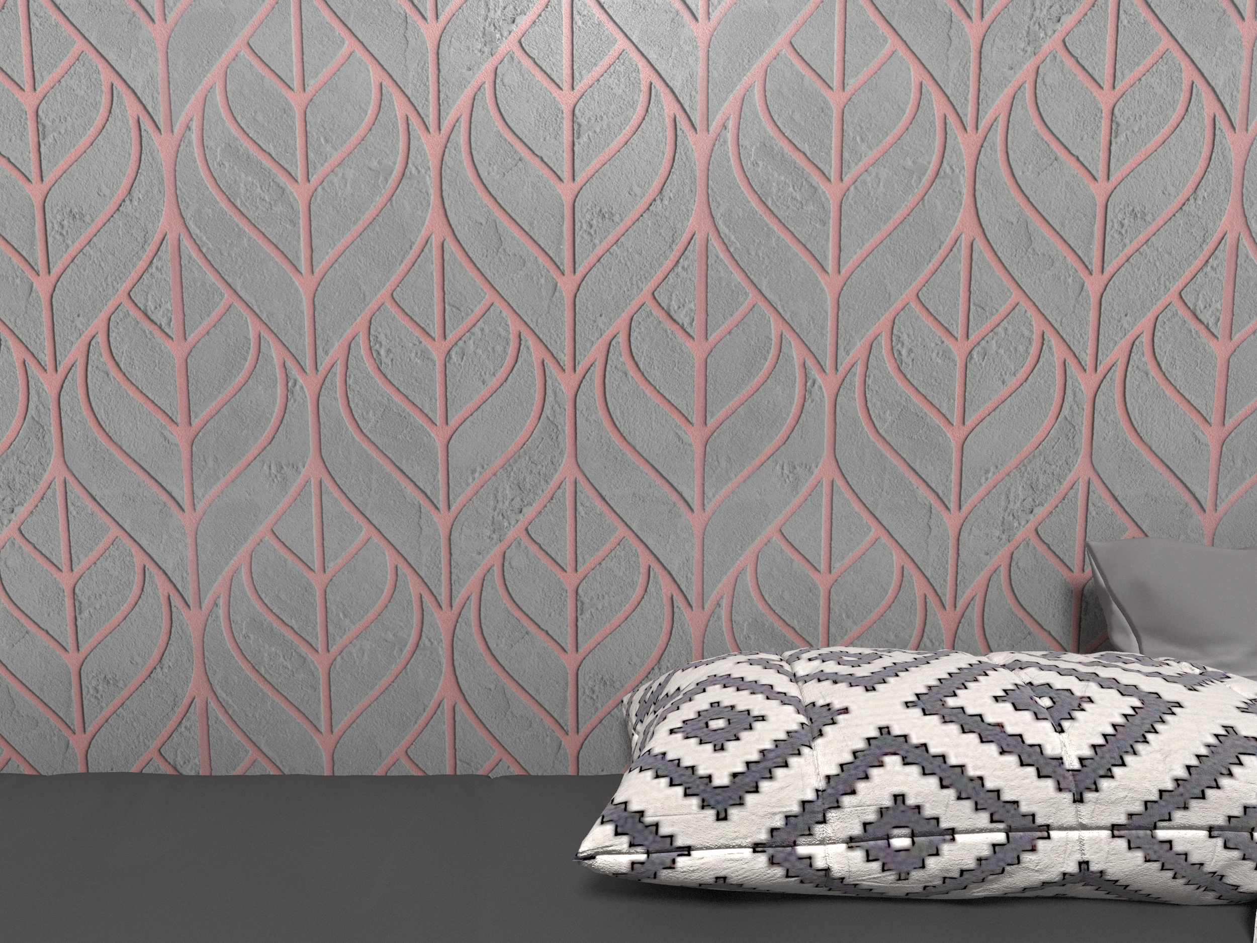 Текстура для фоновых стен «ЛИСТЬЯ» выполняется при помощи трафарета. Пропорции и размеры можно менять в соответствии с геометрией помещения и под конкретную задачу.