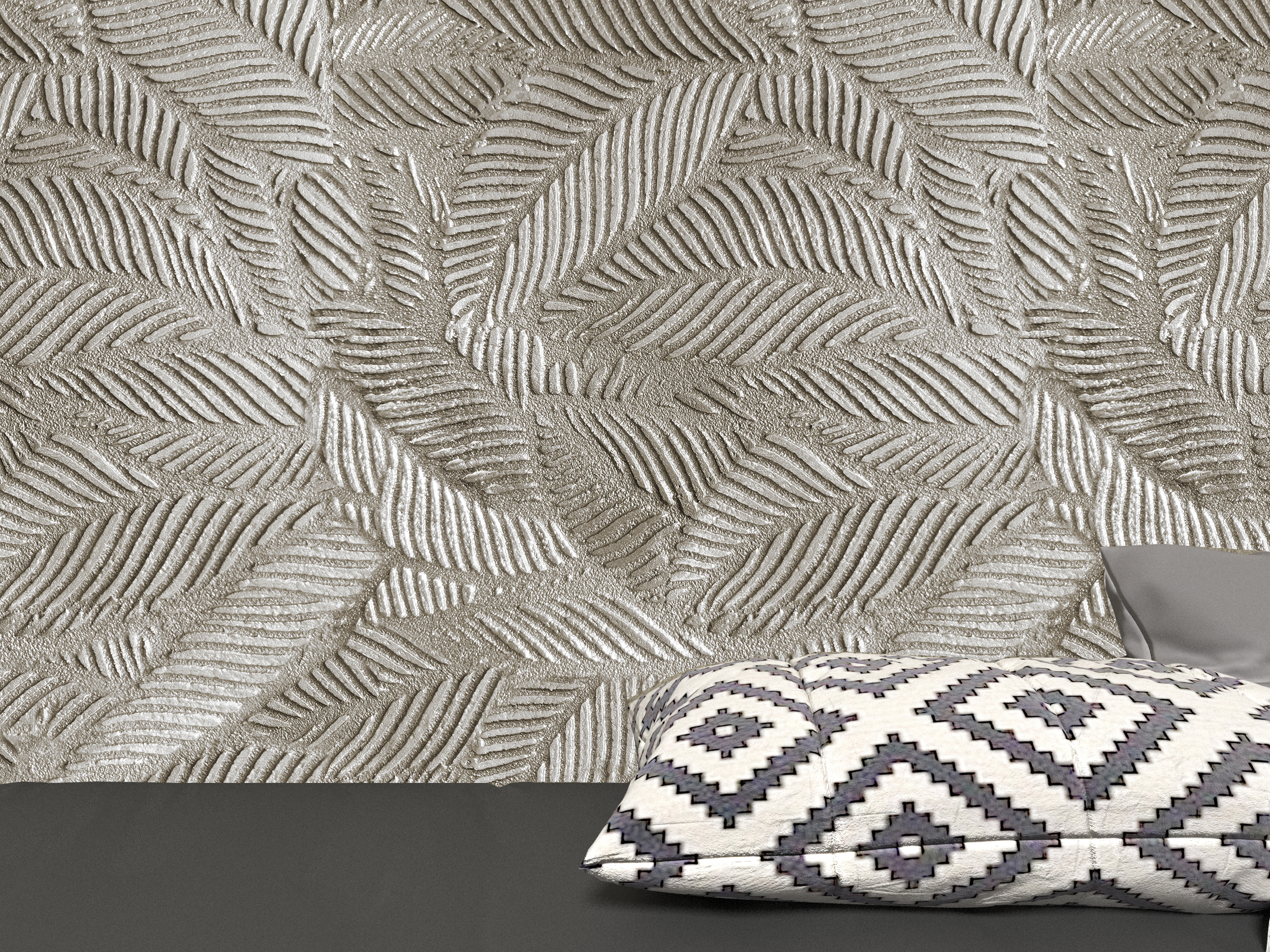 Текстура для фоновых стен "ЛИСТВА" выполняется при помощи готовой салфетки-трафарета. Высоту рельефа можно варьировать, выбирая материал с разной фракцией зерна: от 0,13 до 0,5мм. Декоративное покрытие, выполненное в этой технике, не требует очень тщательной подготовки стен (как под покраску), позволяет скрыть мелкие дефекты. В зависимости от выбранного финишного слоя покрытие может быть матовым, полуматовым, глянцевым или иметь перламутровый блеск.